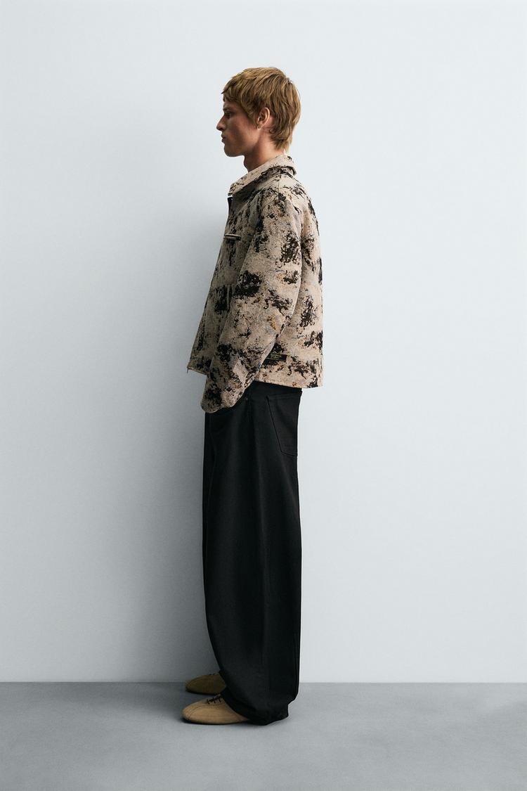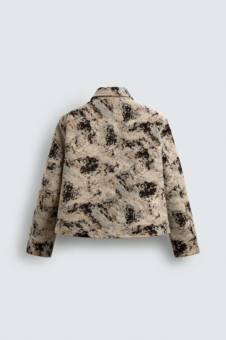 کاپشنی با فرم راحت، ساخته شده از پارچه بافت فشرده. یقه برگردان و آستینهای بلند با دکمههای قابل تنظیم. جیب زیپدار روی سینه و دو جیب در قسمت کمر. زیپ از جلو.