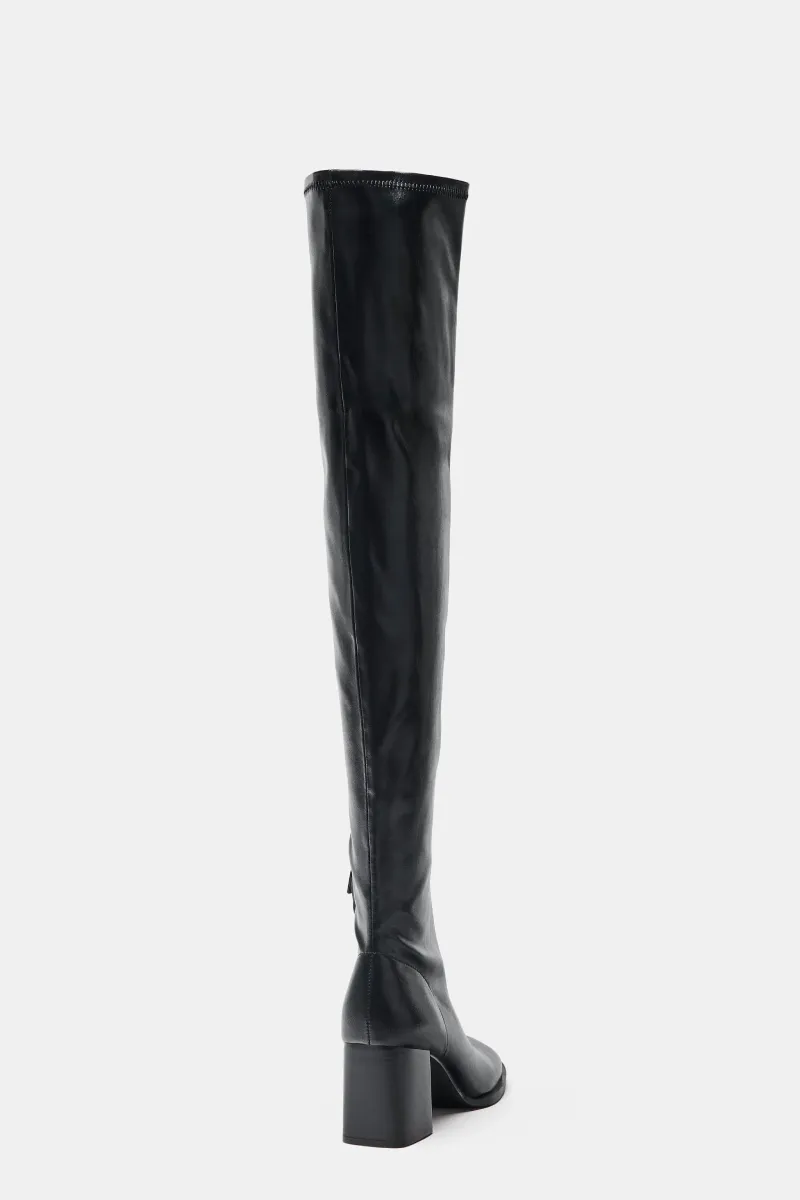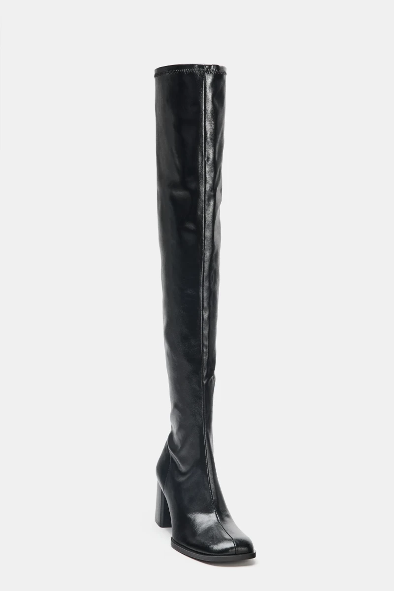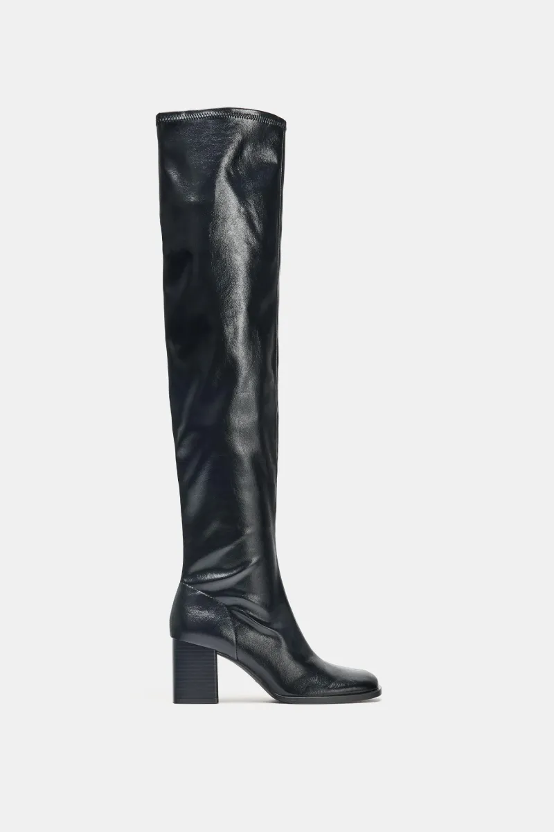 کفش‌های بوت پاشنه‌دار طرح پتنت. ساق بسیار بلند. جزئیات دوخت رویه در جلو. پاشنه قالبی. بسته شدن با زیپ. پنجه مربعی.